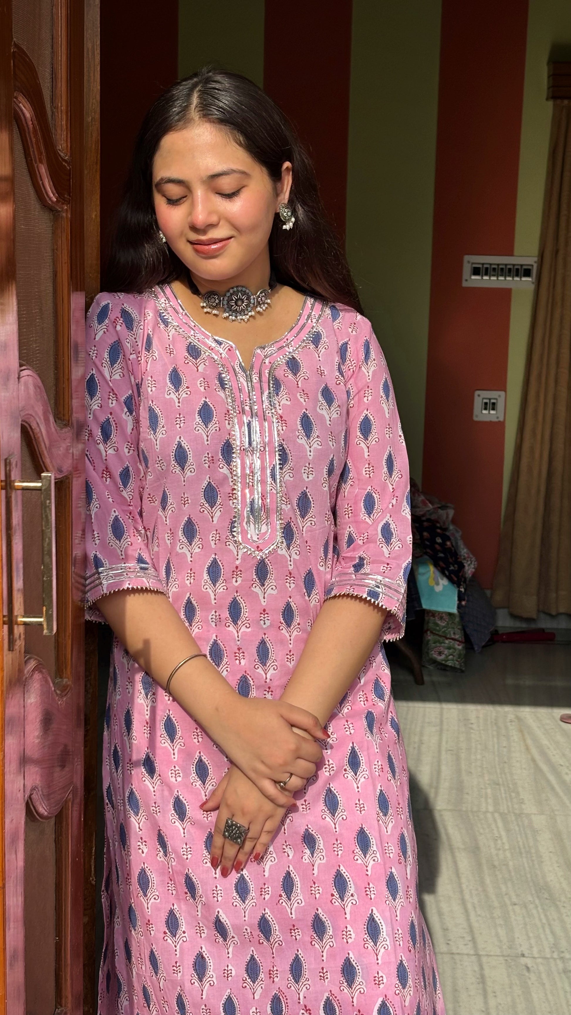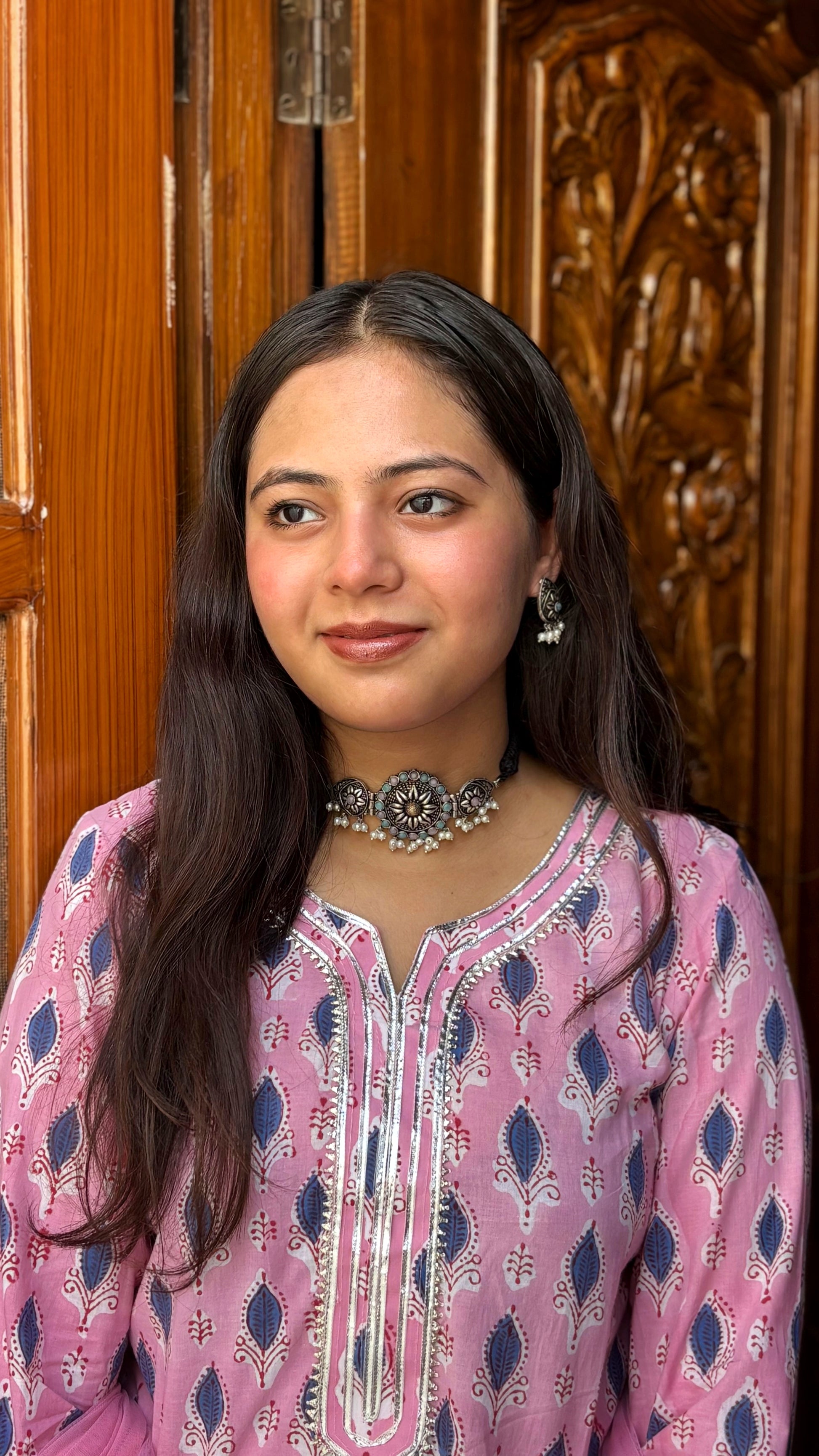 A love letter to tradition, Gulaabo is where timeless craft meets delicate femininity. This three-piece set features a soft blush pink kurta adorned with intricate gota patti work on the neckline and sleeves, paired with a beautifully tailored palazzo that mirrors the same subtle shimmer. The look is completed with a flowing dupatta, kissed with silver detailing and hints of soft blue print that add a whisper of contrast.