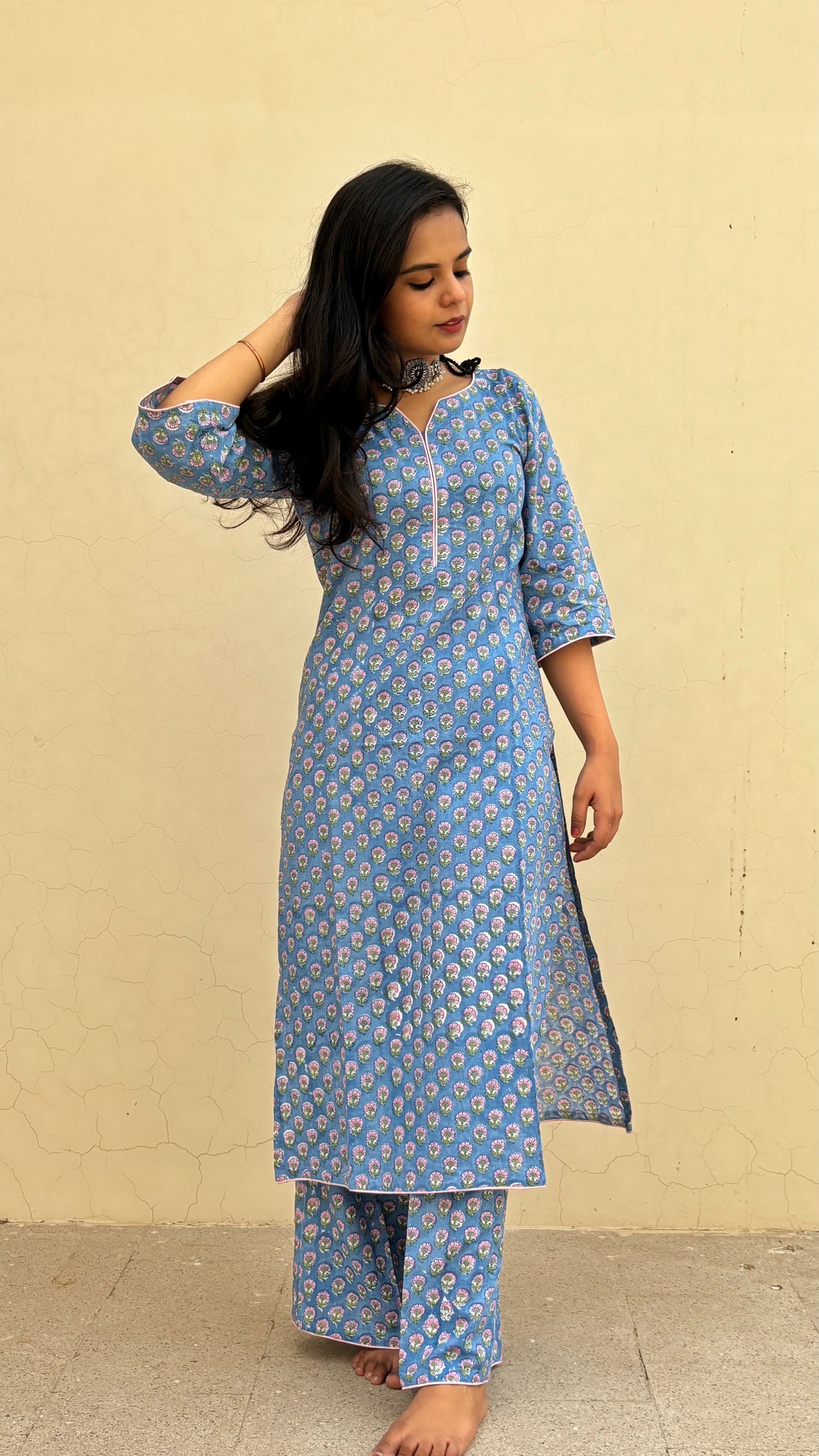 Soft, thoughtful, and easy like a daydream — the Khayal Blue Kurta Set is made for those who carry calm in their presence. Hand-block printed with delicate pink and green floral bootis on a breezy powder blue base, this set features a relaxed straight kurta paired with comfortable matching palazzos.