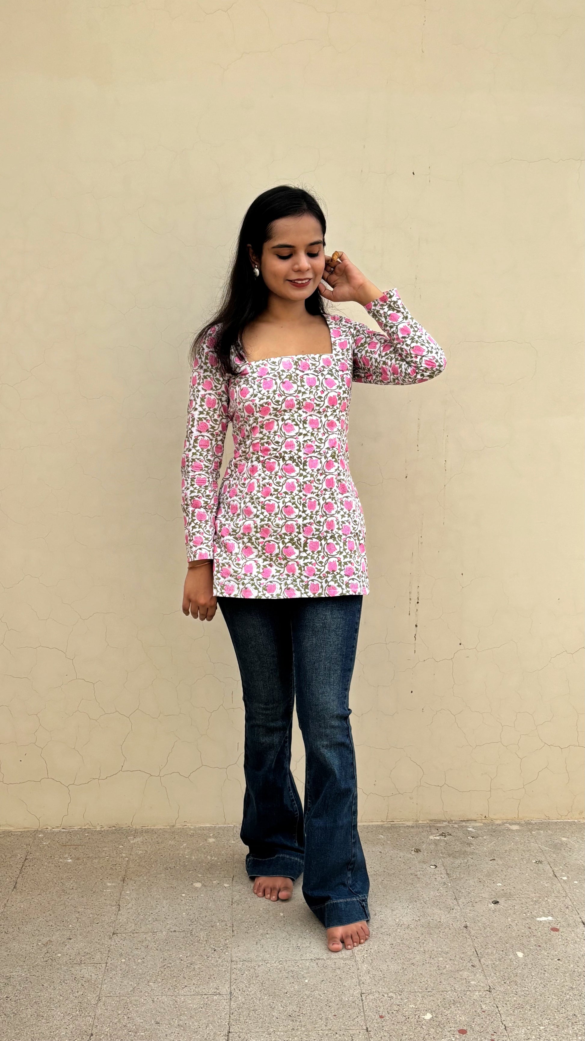 Delicate blooms meet structured elegance in our Rose Print Full Sleeve Kurti. Featuring an all-over hand-block pink rose print on a serene white base, this kurti brings a romantic touch to everyday dressing.